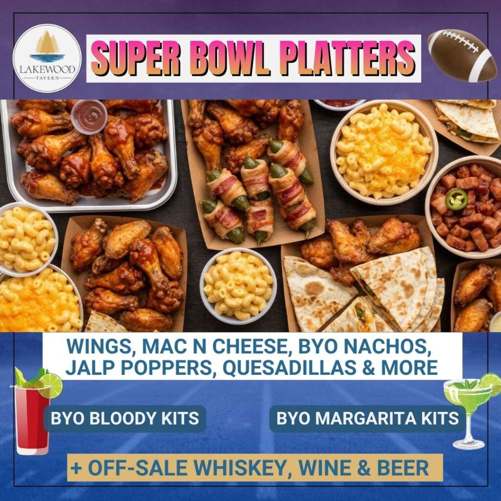Game Day is here! Join us at Lakewood Tavern for the big game with unbeatable drink specials, discounted eats, and party platters to feed your crew.