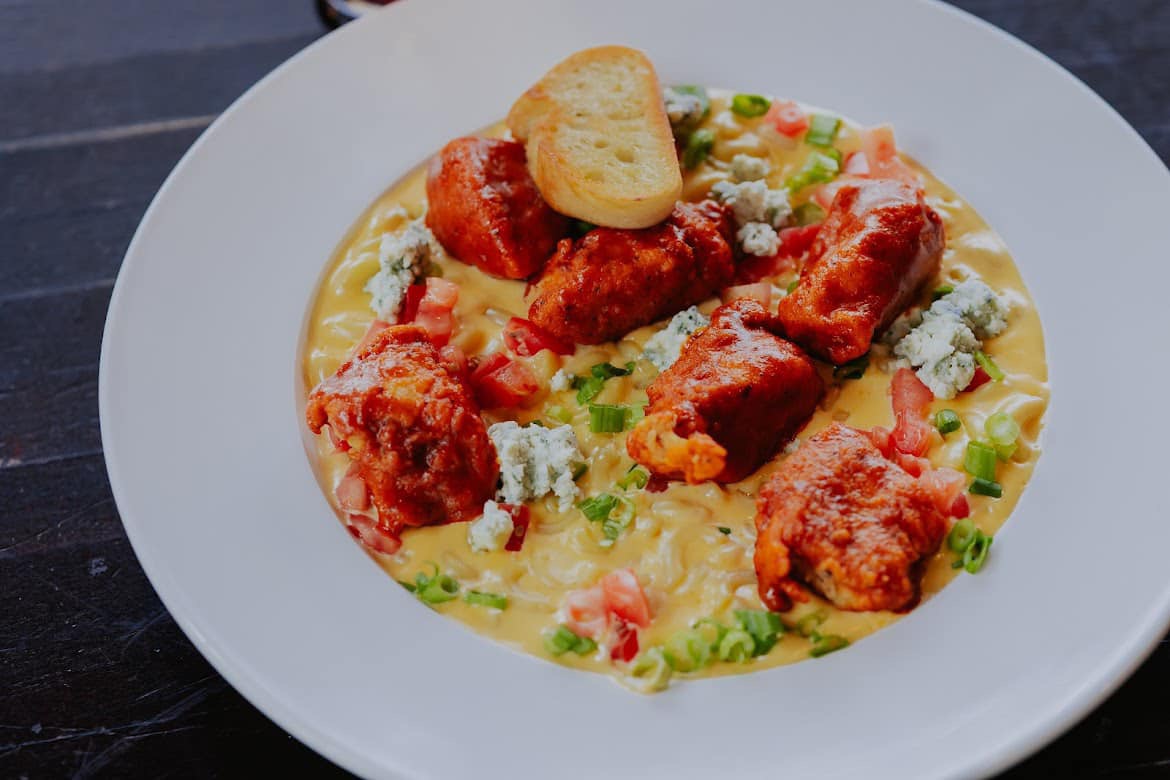 Macaroni noodles in a buffalo cheese sauce, topped with blue cheese crumbles, tomatoes and green onion | Add Chicken for $3.99