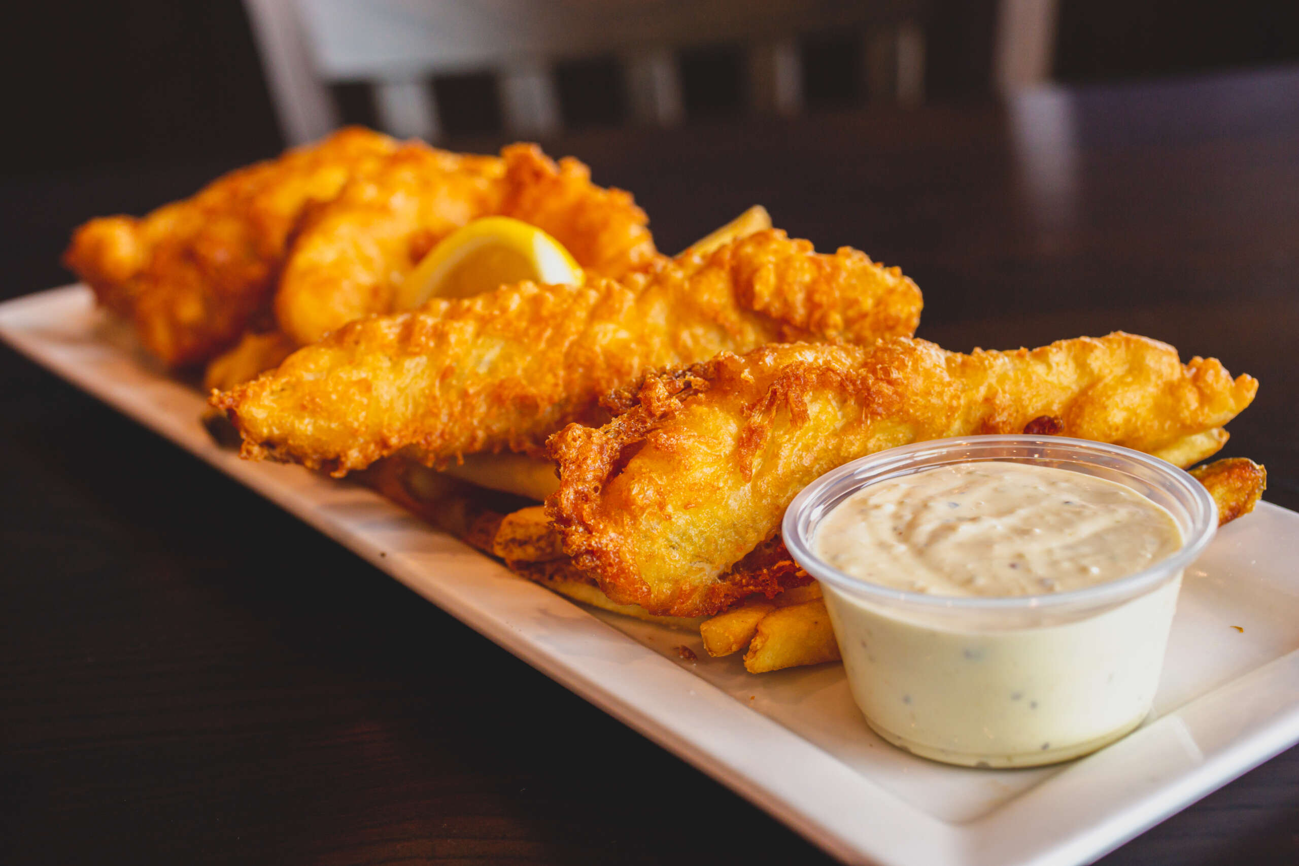 Fresh tenders, hand-battered and golden fried, served with fries and choice of sauce.